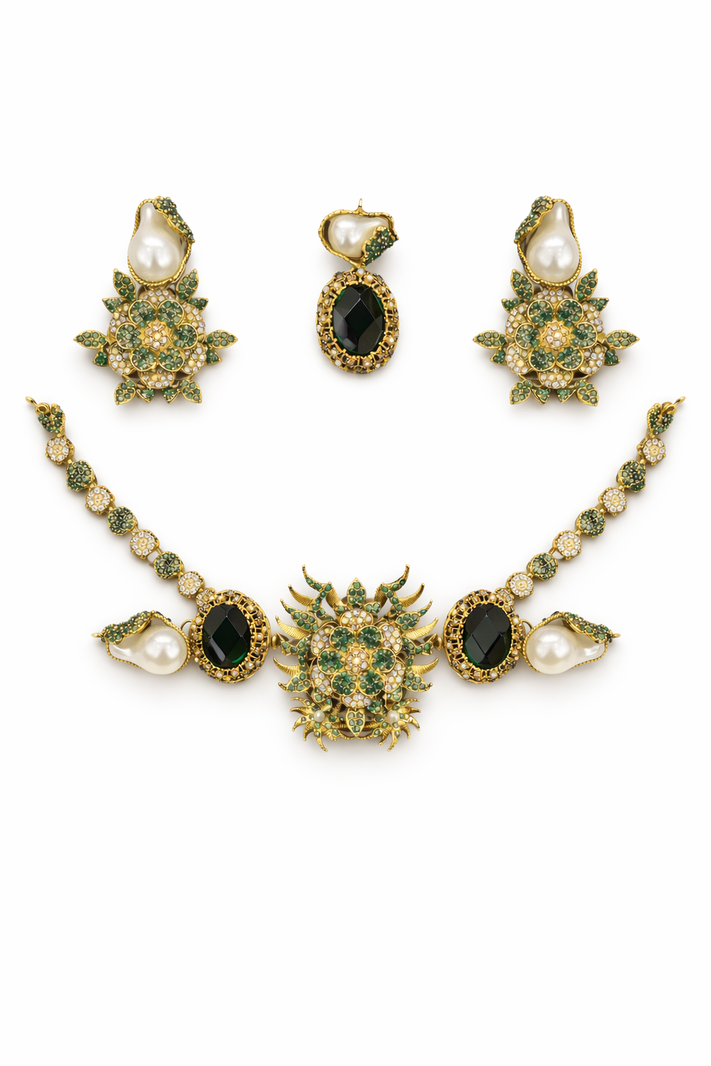 Elevate your festive and formal look with this exquisitely crafted emerald green and pearl statement jewellery set. Designed to exude royal charm, this set features intricate gold-tone detailing adorned with deep emerald stones, delicate crystals, and elegant baroque-style pearls.