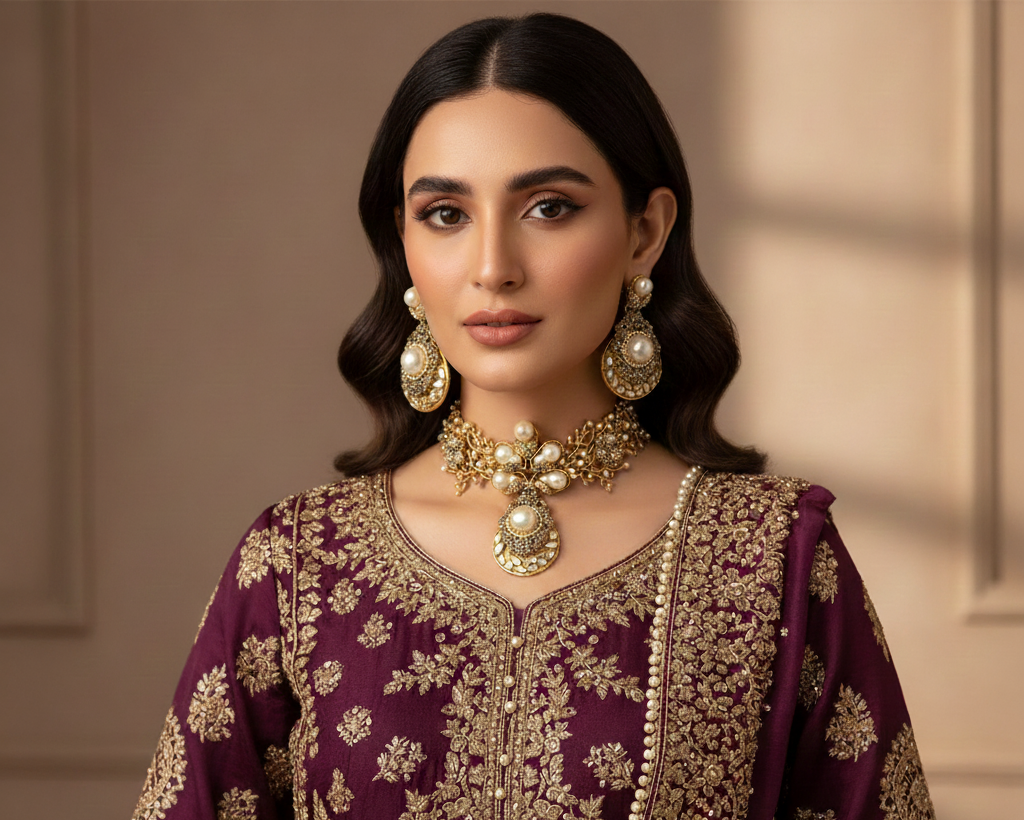 Pairs beautifully with bridal wear, lehengas, sarees, maxis, and heavily embellished outfits for a polished and luxurious appearance.
