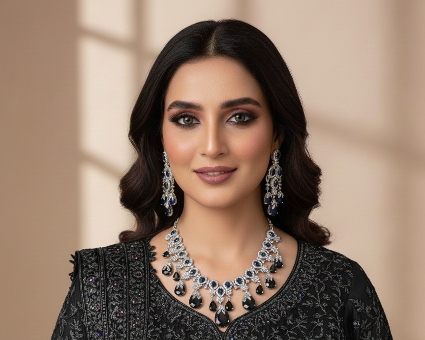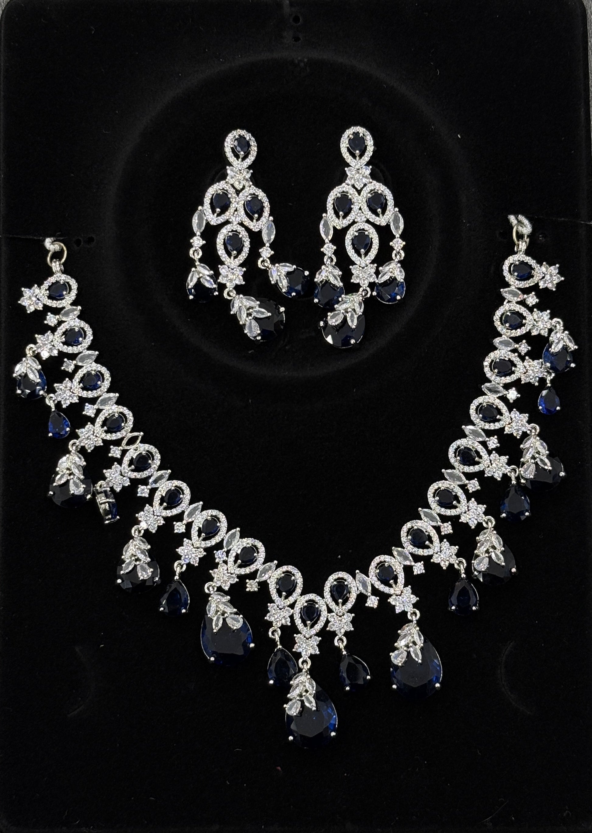 Make an elegant statement with this striking midnight blue drop necklace set, designed to bring refined sparkle and graceful movement to your look. The necklace features a beautifully detailed linked pattern highlighted with shimmering accents and finished with deep blue teardrop drops that create a dramatic yet sophisticated silhouette.